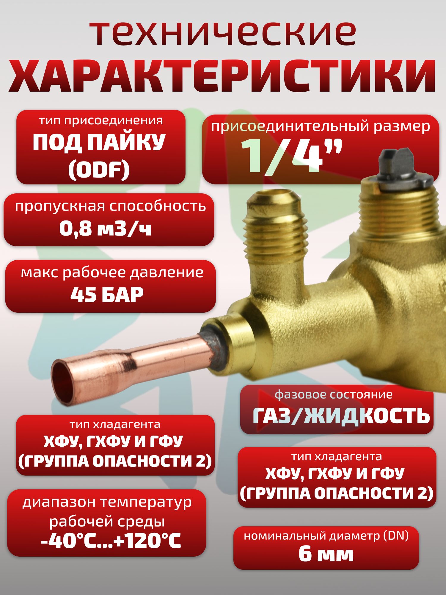 Клапан шаровый имеет присоединительные патрубки под пайку ODF диаметром 1/4 дюйма, что обеспечивает надежное и герметичное соединение с трубопроводом. Наличие сервисного штуцера упрощает процесс обслуживания и диагностики системы. Класс герметичности B и широкий диапазон рабочих температур (от -40 до 120°C) гарантируют надежную работу вентиля в различных климатических условиях (УХЛ4).