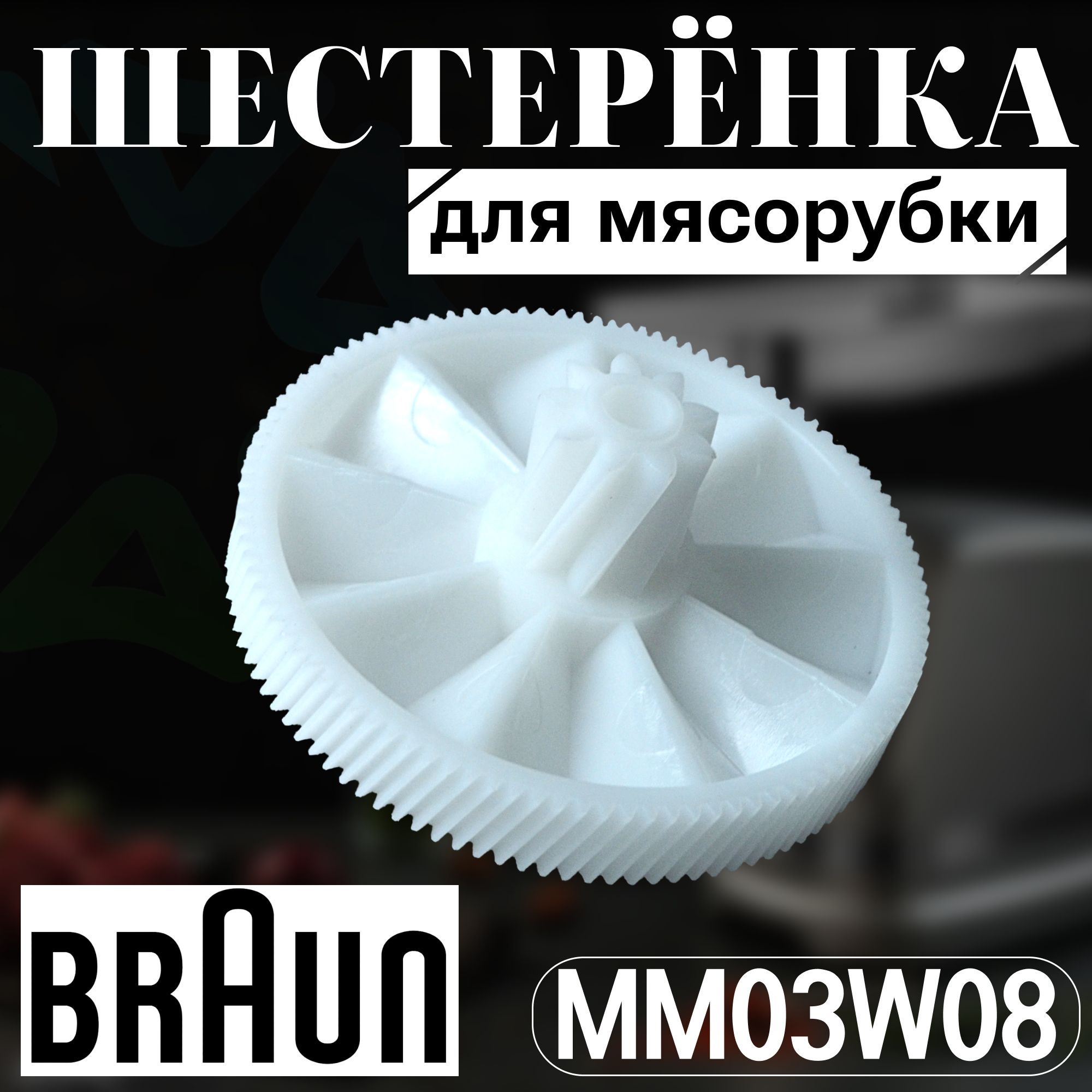 Шестерня для мясорубки MM03W08- это важный элемент механизма, который обеспечивает передачу движения от вала к ножу мясорубки. Она изготовлена из высококачественного материала, что гарантирует её прочность и долговечность. Данная деталь подходит для мясорубок Braun. MM03W08 имеет 9/104 косых зубьев.