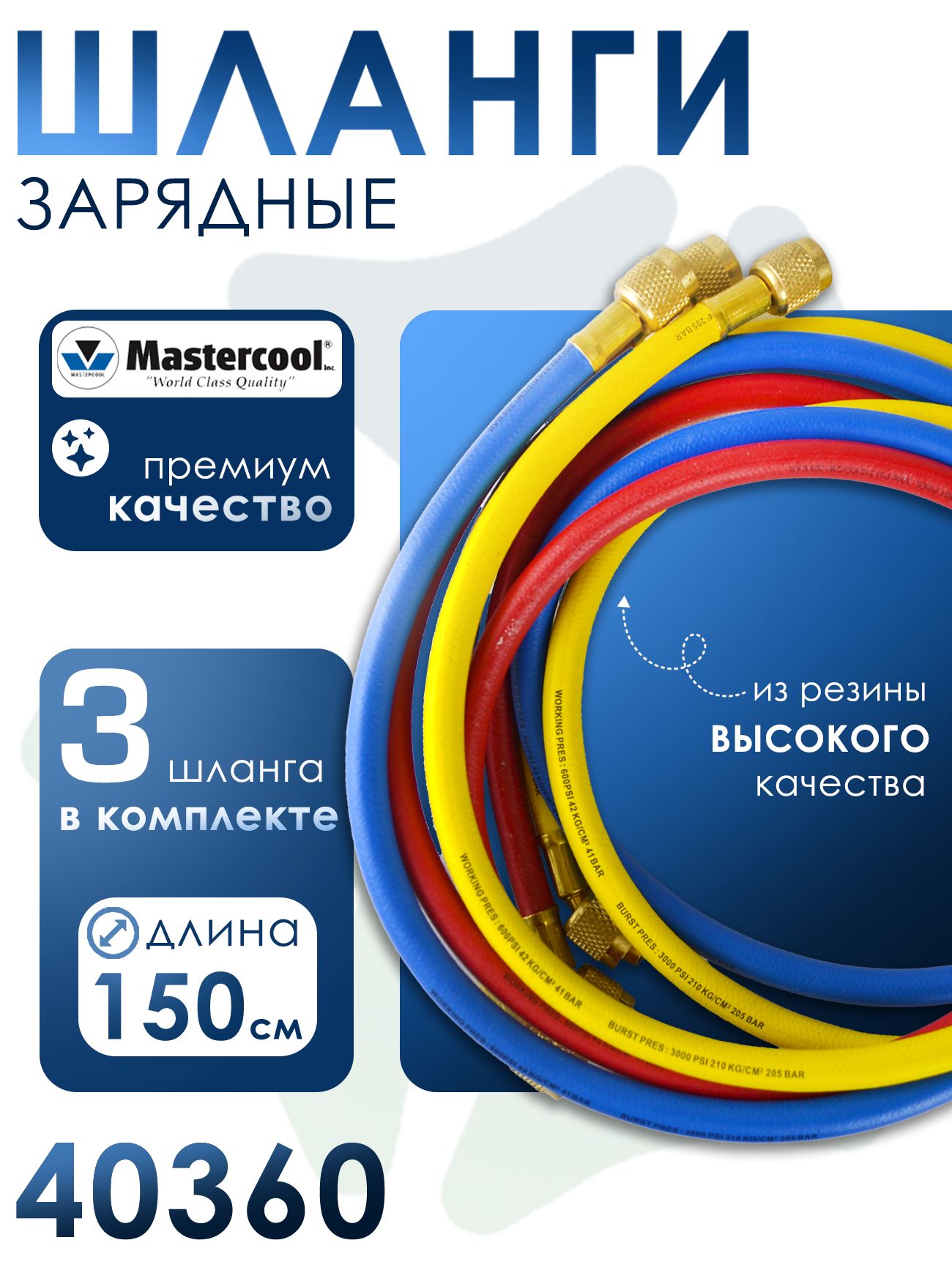 Комплект зарядных шлангов 40360 от компании Mastercool — это незаменимый инструмент для профессионального обслуживания и диагностики холодильных систем и систем кондиционирования. В набор входят три высококачественных шланга длиной 150 см каждый, что обеспечивает удобство работы в различных условиях. Комплект позволяет одновременно выполнять несколько операций, что существенно ускоряет процесс обслуживания. Шланги изготовлены из прочных материалов, устойчивых к воздействию хладагентов и агрессивных рабочих сред. Особое внимание уделено герметичности соединений, что гарантирует безопасность при эксплуатации. На концах каждого шланга установлены надёжные гайки с резьбой F1/4" SAE, которые обеспечивают быстрое и надёжное подключение к манометрической станции или заправочному оборудованию.