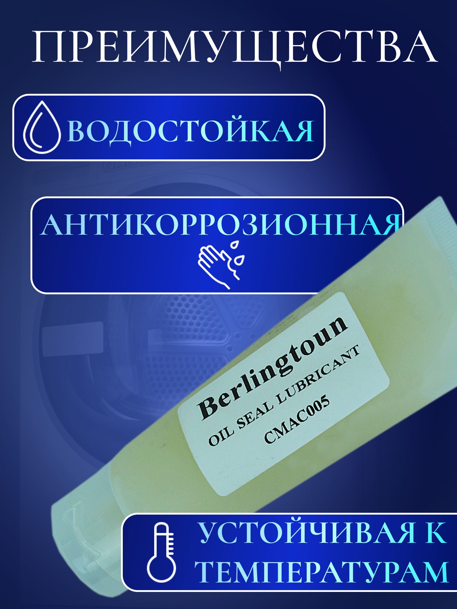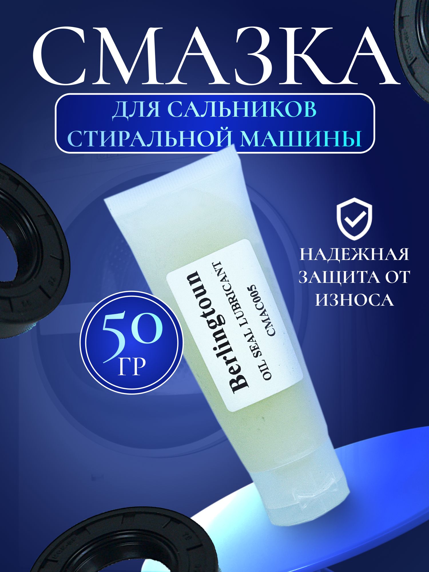 Данная смазка для сальников стиральной машины от бренда Berlingtoun нужна для предотвращения быстрого износа оборудования из-за трения между внутренней частью сальника и валом машины, защиты подшипника от воды и влаги. Эта смазка поставляется в тюбике и ее объем составляет 50 гр.