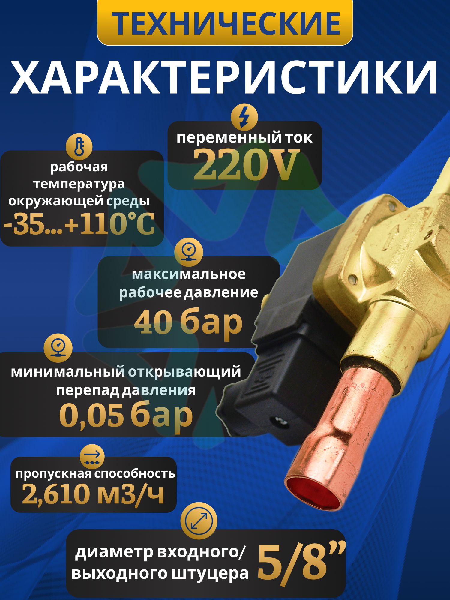 Соединение под пайку 5/8" обеспечивает прочное и герметичное соединение с трубопроводом, предотвращая утечки хладагента. Максимальное рабочее давление в 40 бар гарантирует безопасную работу даже в системах с высоким давлением. Коэффициент Kv, равный 2,610 м3/ч, указывает на высокую пропускную способность вентиля, обеспечивая эффективный поток хладагента через систему.