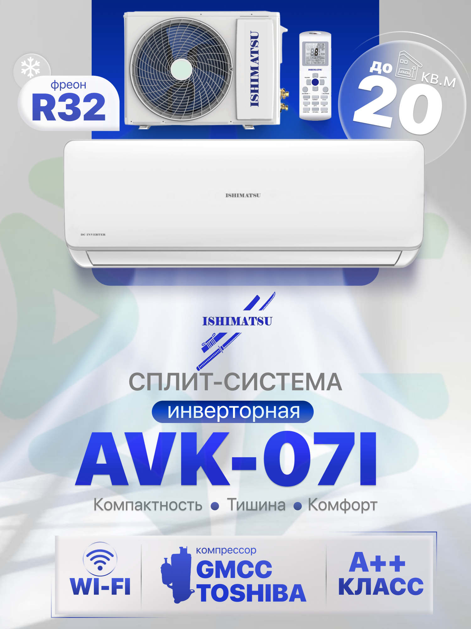 Сплит система ISHIMATSU AVK 07I - современное климатическое решение для небольших помещений (до 20 м²). Модель сочетает энергоэффективность, интеллектуальные функции и продуманный дизайн, обеспечивая комфортный микроклимат круглый год.