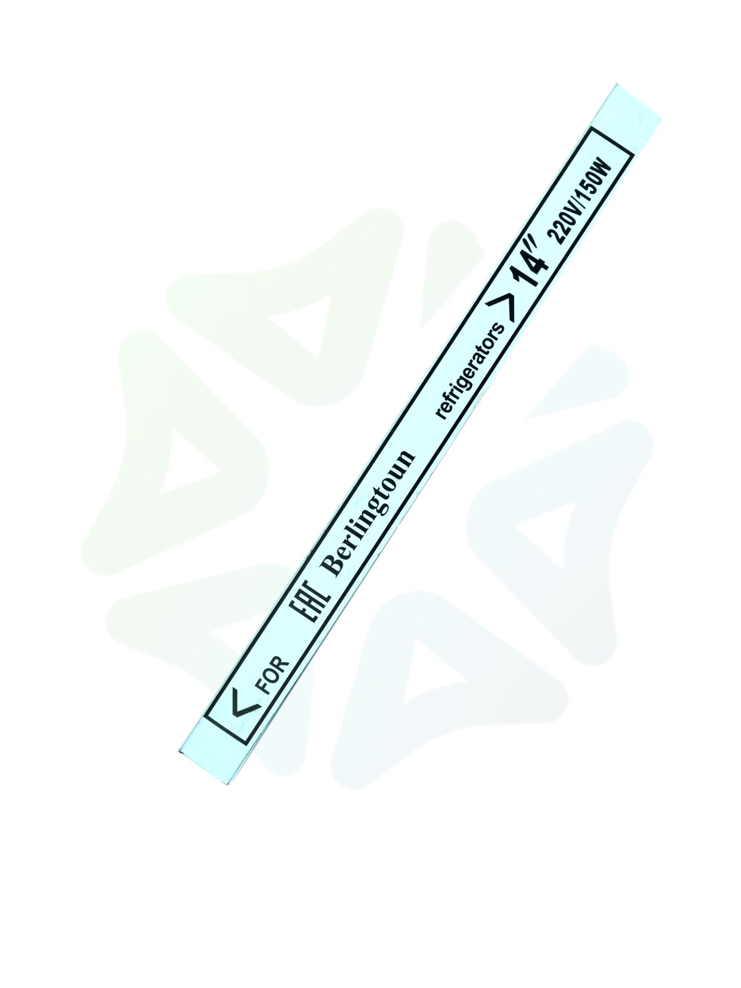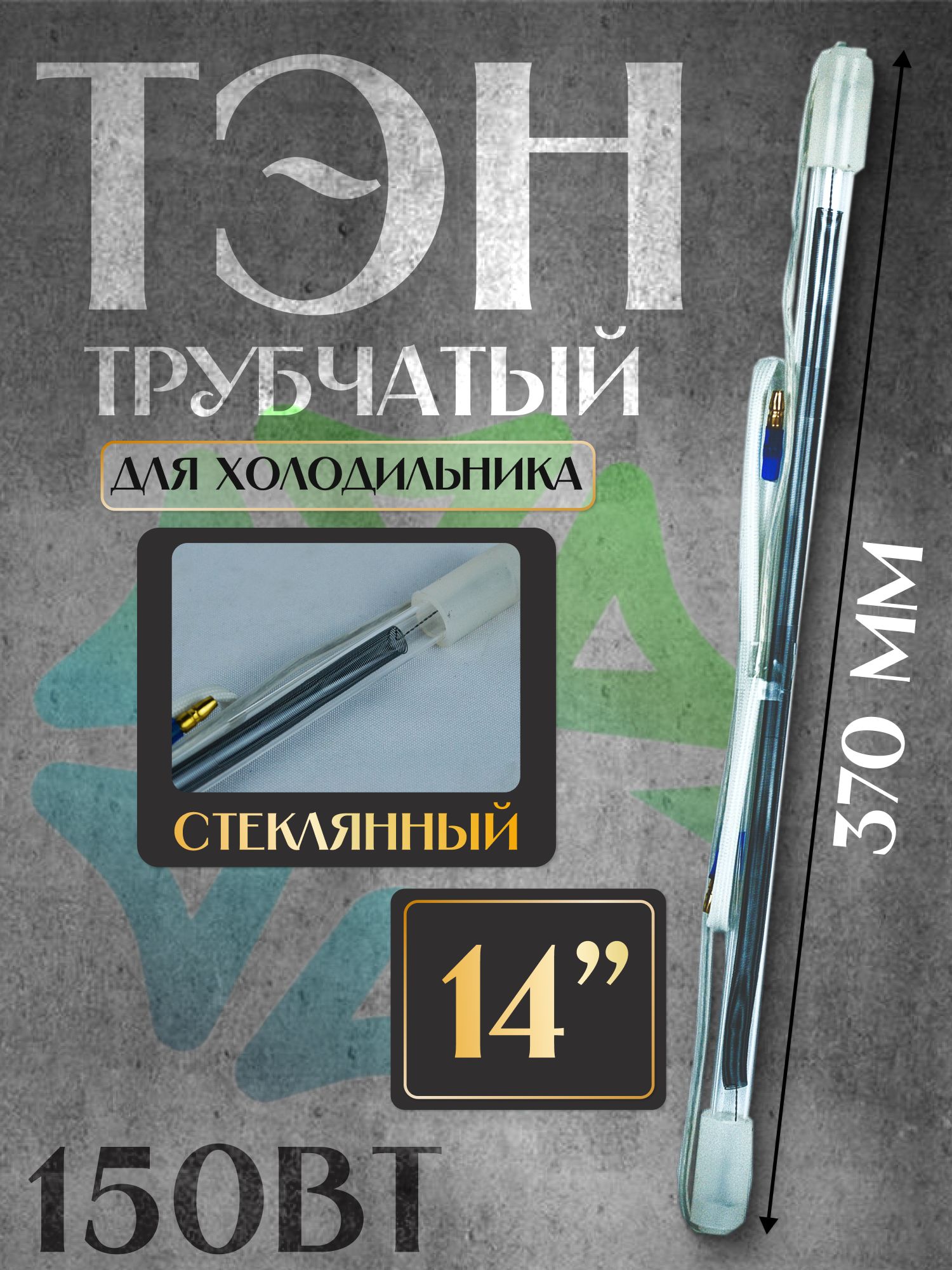ТЭН стеклянный трубчатый, обладающий диаметром в 14 дюймов ( 14" ) и мощностью в 150 Вт, был разработан с целью обеспечения процесса размораживания холодильника и предотвращения образования наледи ("шубы") на испарителе. Его длина составляет 370 миллиметров.