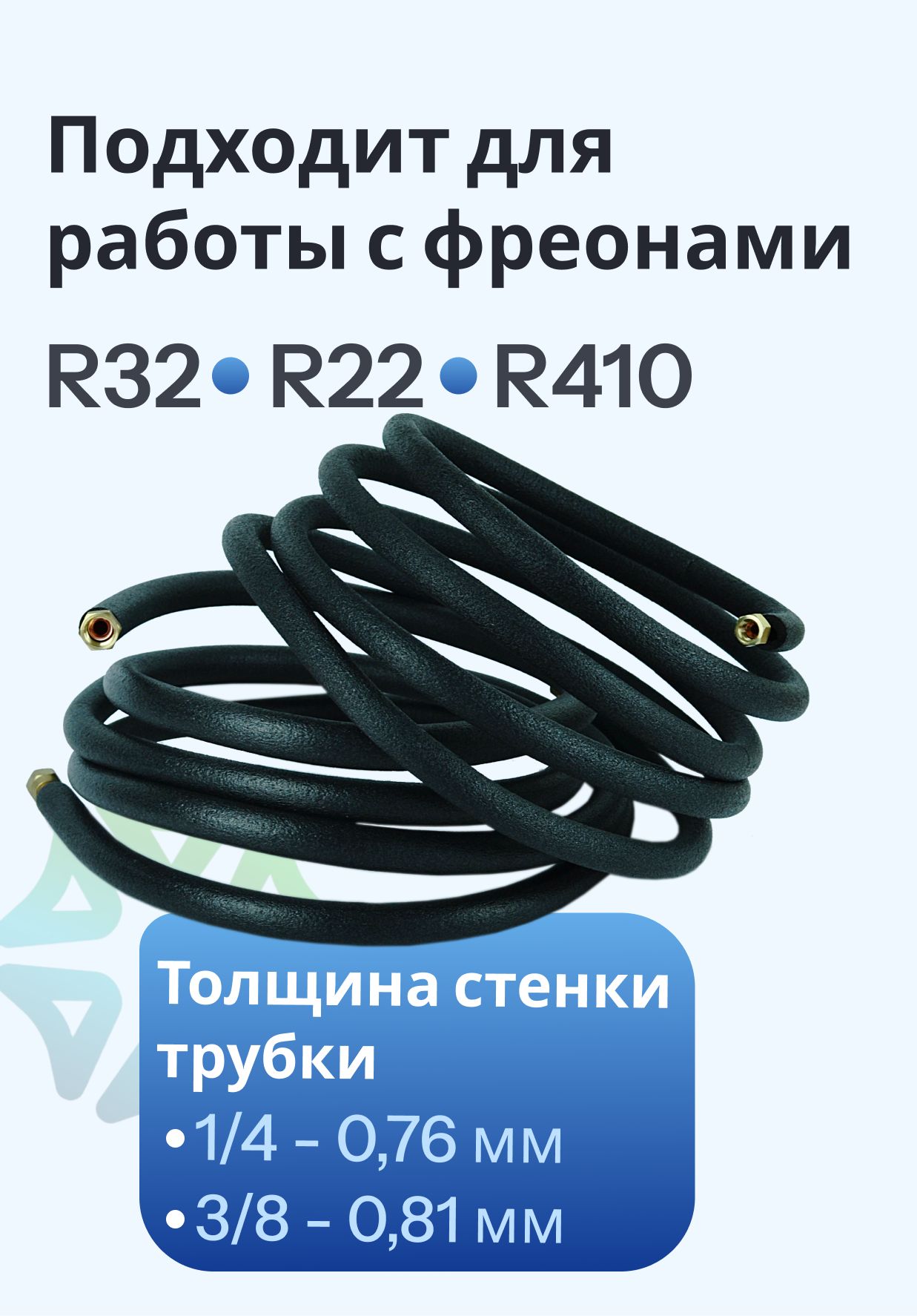 Данный монтажный комплект для установки сплит-систем предназначен для работы с фреоном R32, R22 и R410, что делает его подходящим для большинства современных кондиционеров.