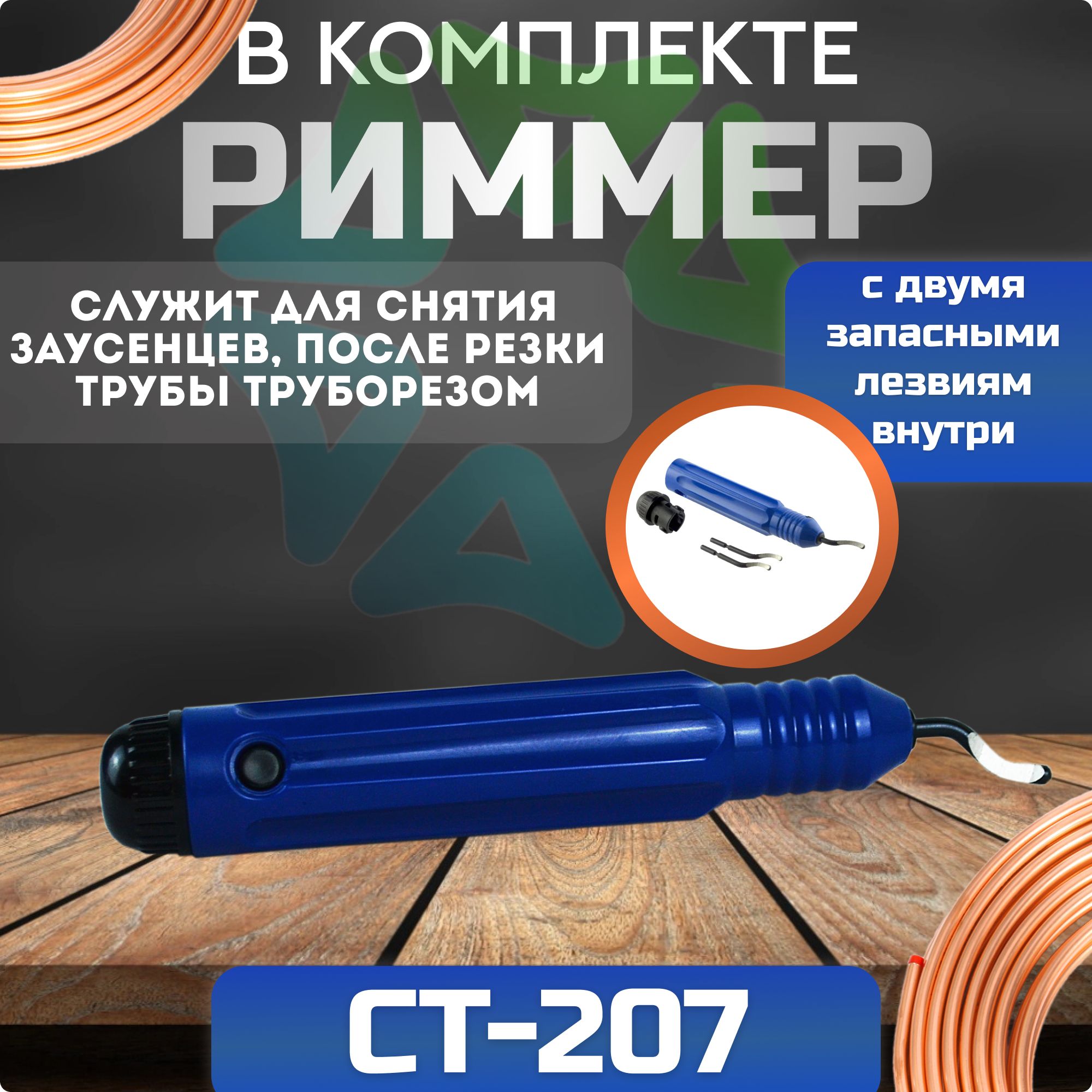 Для более удобной работы с трубами в комплект идут риммер и труборез, который предназначен для резки труб диаметрами от 5 мм и до 32 мм.