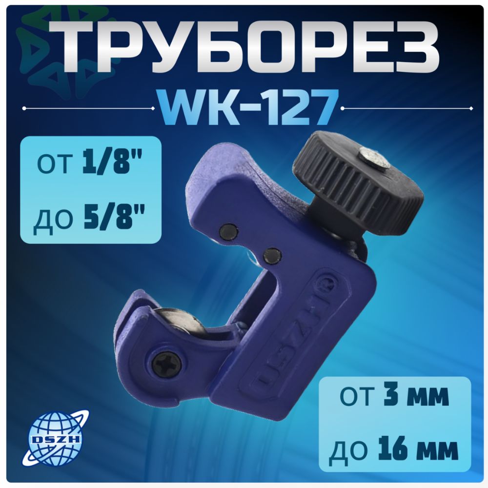Труборез WK-127 от бренда DSZH идеально подходит для резки медных, титановых, нержавеющих и алюминиевых труб в ограниченном пространстве благодаря своей компактности, легкости и быстроте действий. Благодаря данному инструменту удается сделать аккуратный, строго перпендикулярный оси трубы разрез с ровным краем, не создавая при этом опилок. Может применяться для труб диаметром от 1/8" до 5/8" (3 мм - 16 мм).