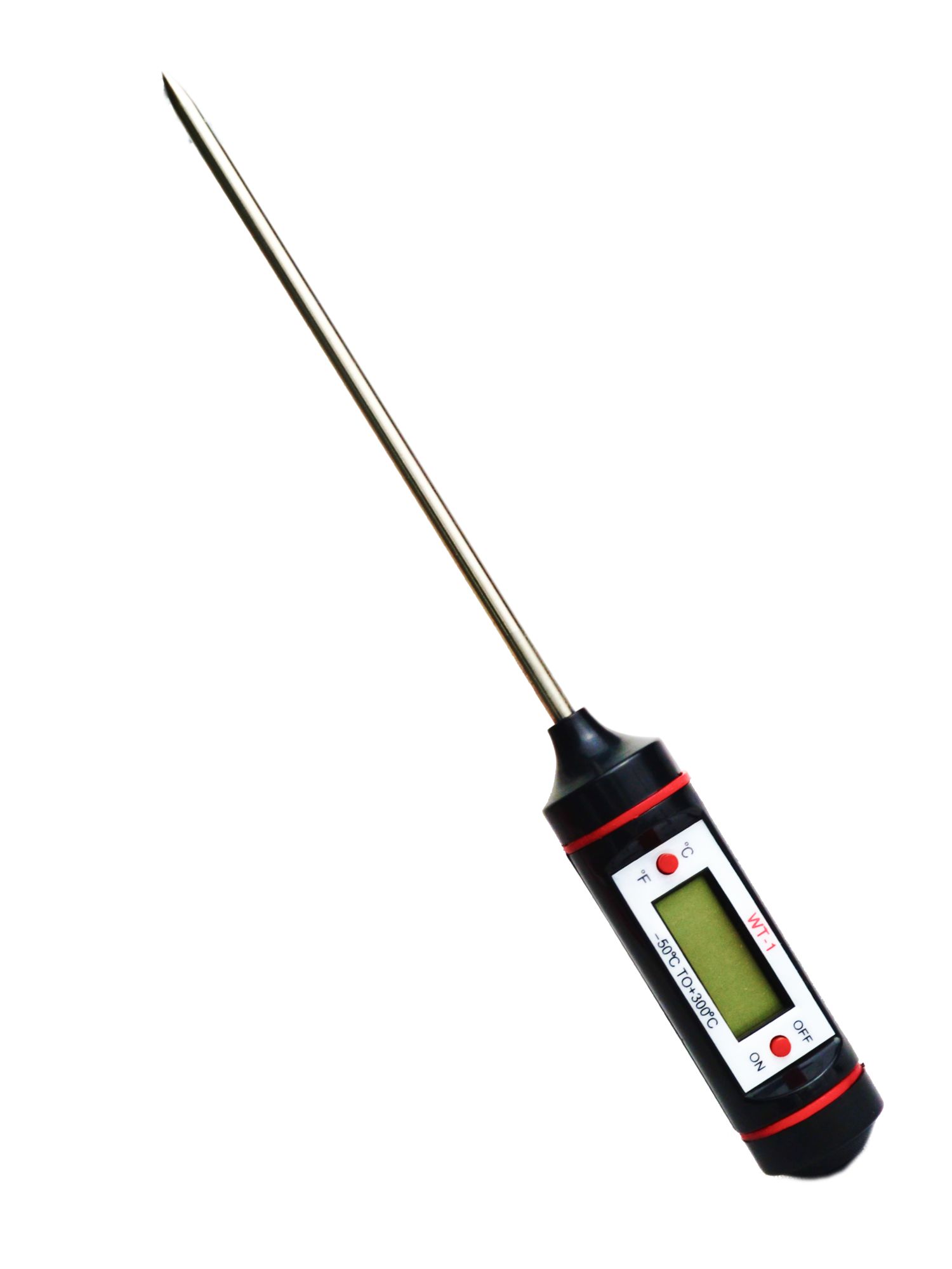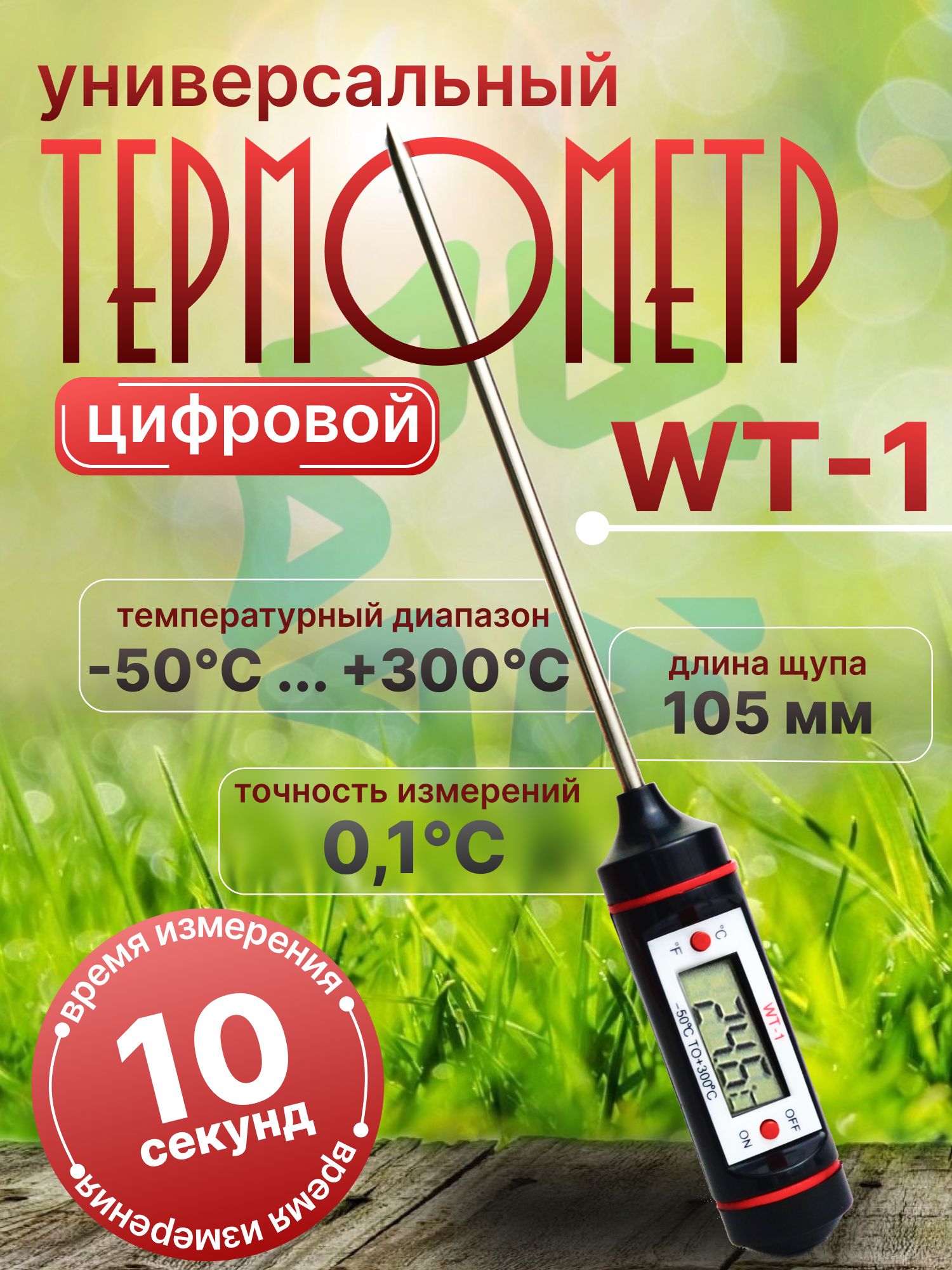 Контактный электронный цифровой термометр WT-1 ( кулинарный термометр ) представляет собой удобный и простой в использовании прибор с жидкокристаллическим дисплеем и встроенной памятью, запоминающей последнее измерение. Он оснащен игольчатым щупом из нержавеющей стали с пластиковой ручкой, которая обеспечивает удобное крепление на карманах или поясе.Для измерения температуры необходимо погрузить конец щупа WT-1 в среду, которую требуется измерить. Чтобы снизить риск поломки и получить более точные результаты, рекомендуется не погружать щуп ниже 20 мм от корпуса термометра. Результат измерения отобразится на дисплее WT-1 через несколько секунд. Данное устройство применяется для измерения температуры продуктов при их хранении в холодильных установках, при термической обработке, для измерения температуры различных жидкостей, сыпучих материалов, грунта, для тестирования отопительных систем,при изготовлении бетона, а также используется в автосервисе . Электронный термометр WT-1 сделан из качественных материалов,что обеспечивает долгий срок службы и безопасность в использовании,так как не содержит ртути. Прибор способен долго работать от одной алкалиновой батареи 1,5 В типа LR44 батареи, которая входит в комплект, и способен отключаться автоматически с целью экономии энергии. Данный термощуп имеет возможность переключения между режимами °C (градусы Цельсия) и °F (градусы Фаренгейта).