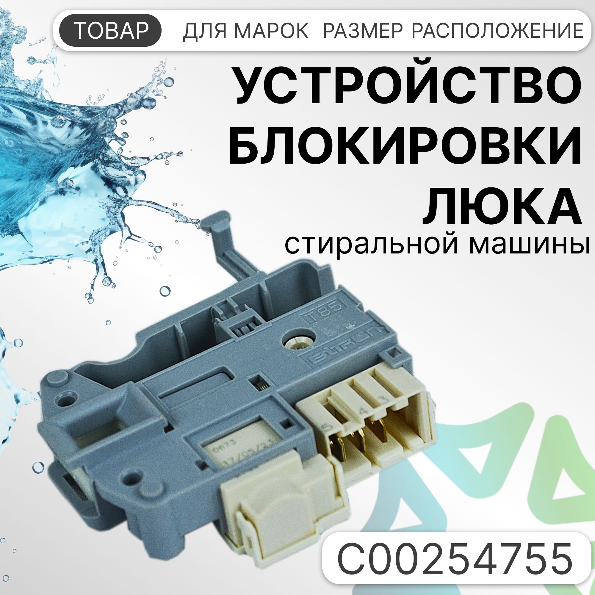 Устройство блокировки люка (УБЛ) C00254755 - запчасть стиральной машины Hotpoint-Ariston и Indesit, которая предназначена для надежного запирания дверцы люка в течение всего цикла стирки. Данный замок способствует плотному контакту дверцы люка стиральной машины и манжеты аппарата. Во время стирки УБЛ под действием тепла мгновенно разогревается, изгибается и с помощью специального фиксатора блокирует дверцу загрузочного люка. Размеры устройства - 75*75 мм. Количество контактов - 3. Коды замены: 254755, 285597, 254755, INT007ID, INT005ID, 482000023034.