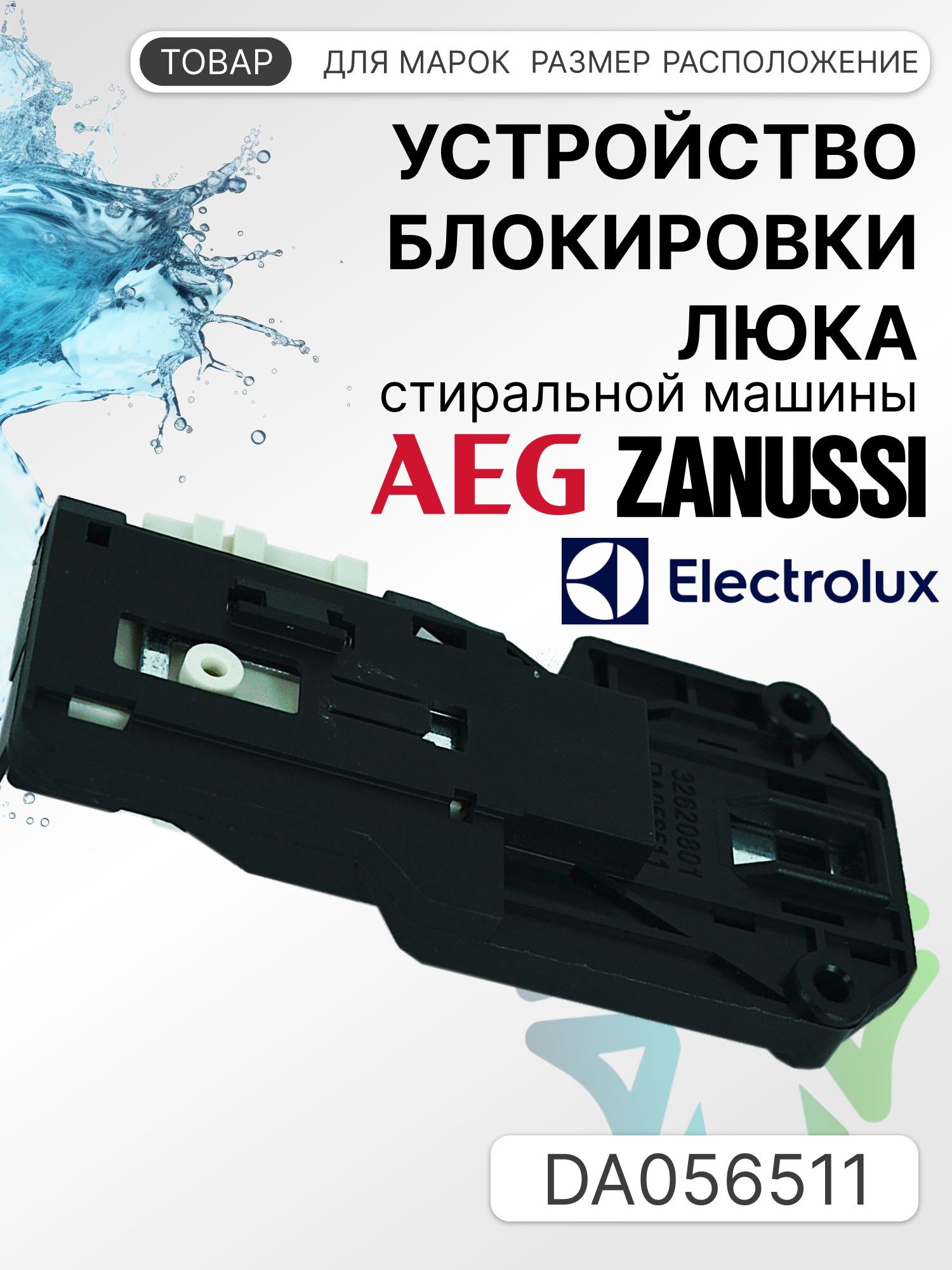 Устройство блокировки люка (УБЛ) 32620801 DA056511 - запчасть стиральной машины AEG, Electrolux и Zanussi, которая предназначена для надежного запирания дверцы люка в течение всего цикла стирки. Данный замок способствует плотному контакту дверцы люка стиральной машины и манжеты аппарата. Во время стирки УБЛ под действием тепла мгновенно разогревается, изгибается и с помощью специального фиксатора блокирует дверцу загрузочного люка. Количество контактов - 3.