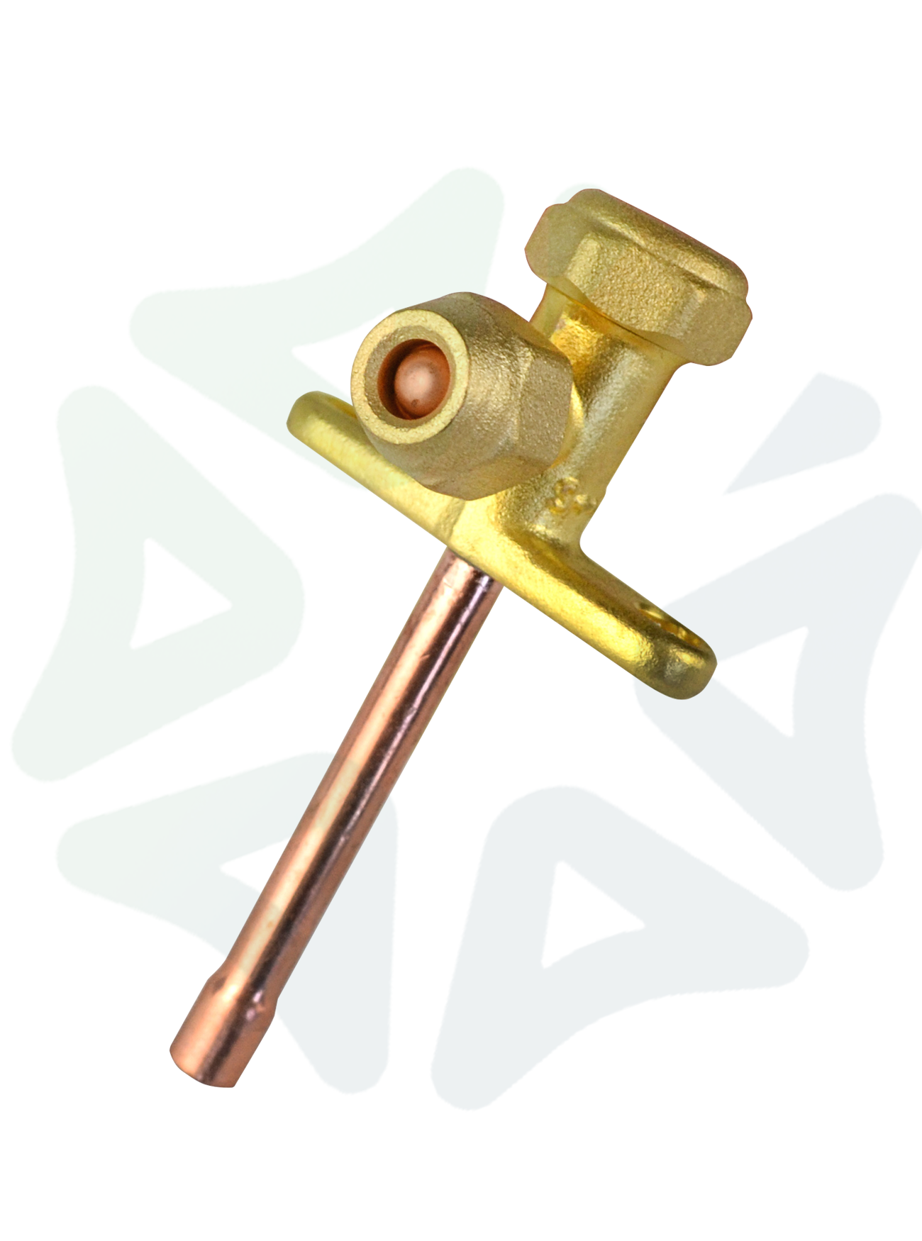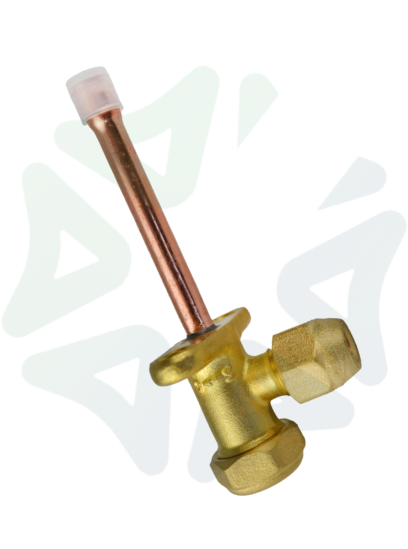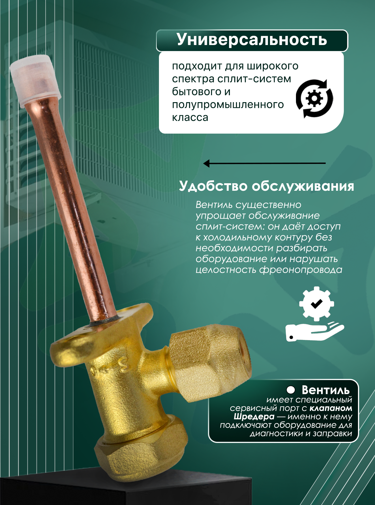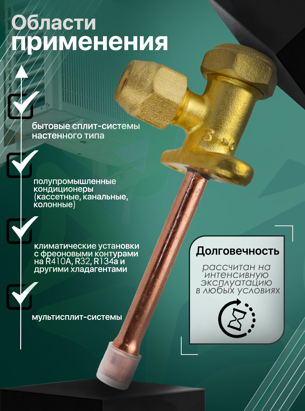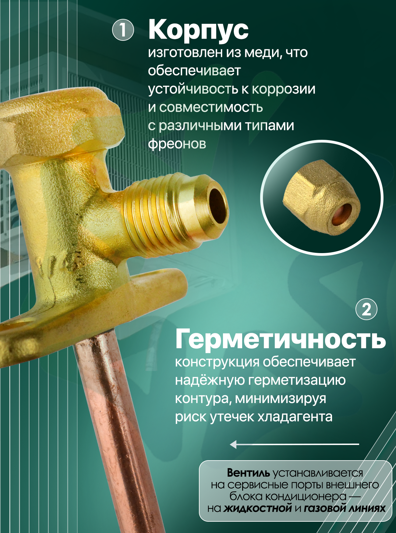 Конструкция вентиля выполнена в угловом исполнении, что значительно упрощает монтаж и обслуживание в условиях ограниченного пространства — например, при плотной компоновке элементов на внешнем блоке кондиционера. Основной корпус изготовлен из меди, что гарантирует высокую устойчивость к коррозии, совместимость с большинством современных хладагентов (включая R410A, R32, R134a и другие) и долговечность эксплуатации в условиях перепадов температур и давления.