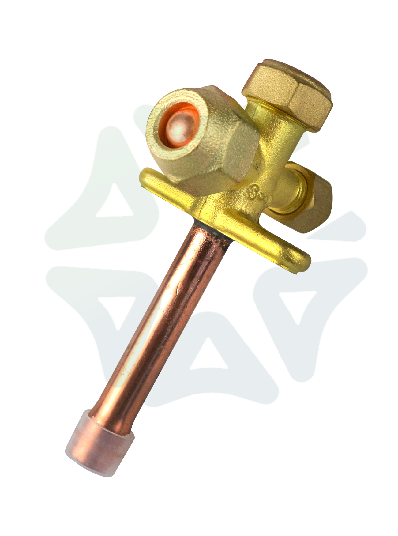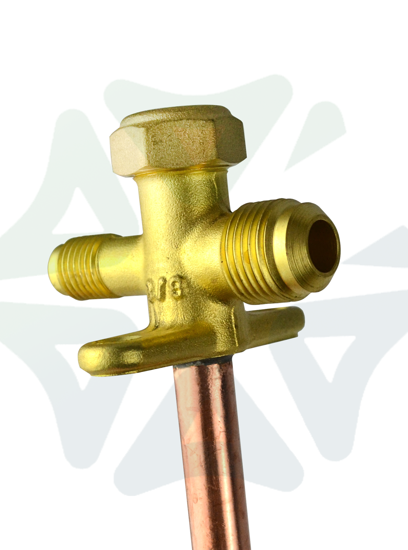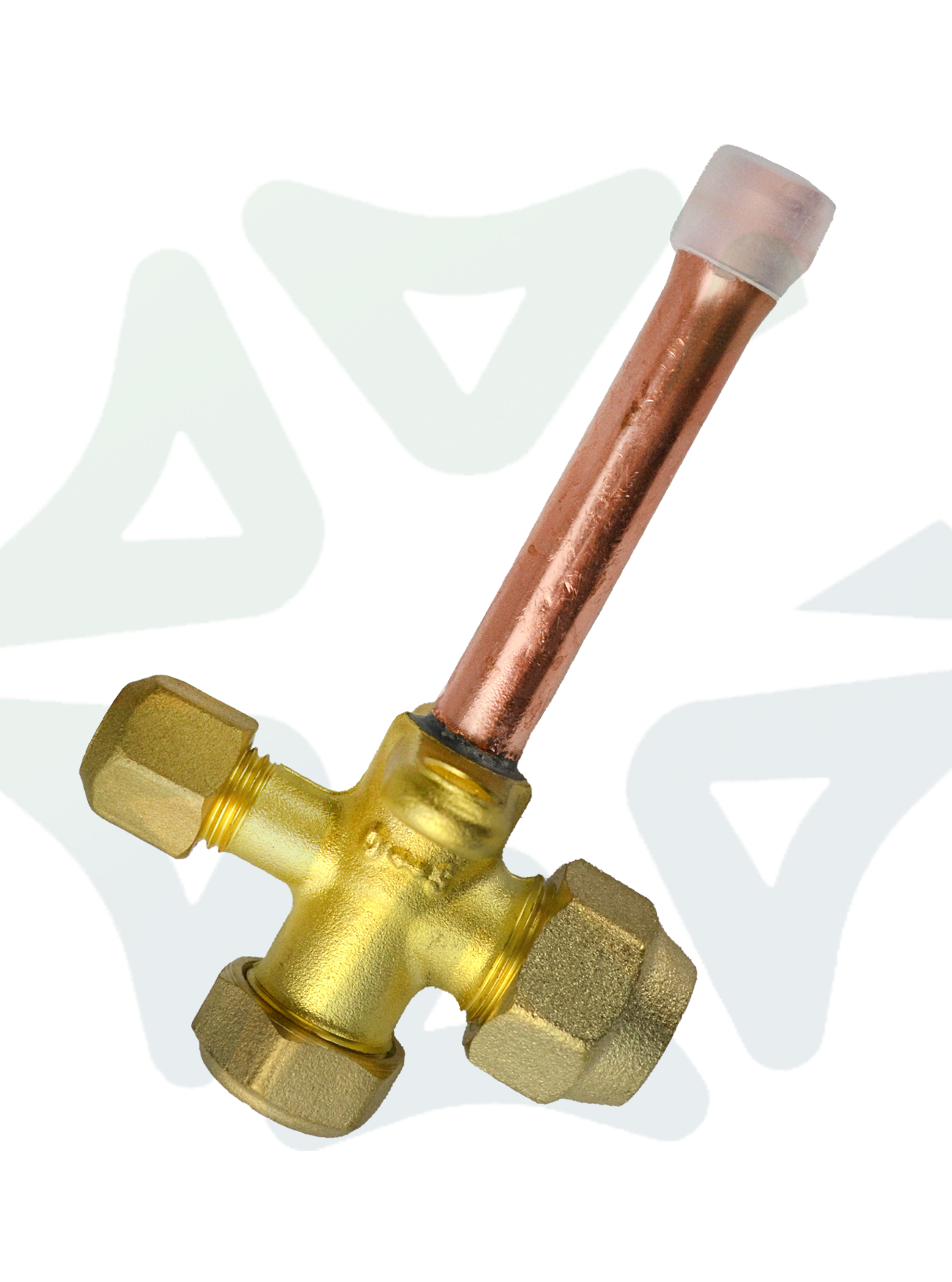 Вентиль имеет три основных патрубка с присоединительным размером 3/8" (9,5 мм, стандарт 3/8" SAE) для подключения к жидкостной и газовой линиям фреонопровода. Ключевой элемент конструкции — сервисный порт с клапаном Шредера, который служит точкой подключения внешнего оборудования: манометрической станции, заправочных шлангов, вакуумного насоса или течеискателя. Максимальное рабочее давление — 28 бар, что соответствует нагрузкам в современных системах кондиционирования.