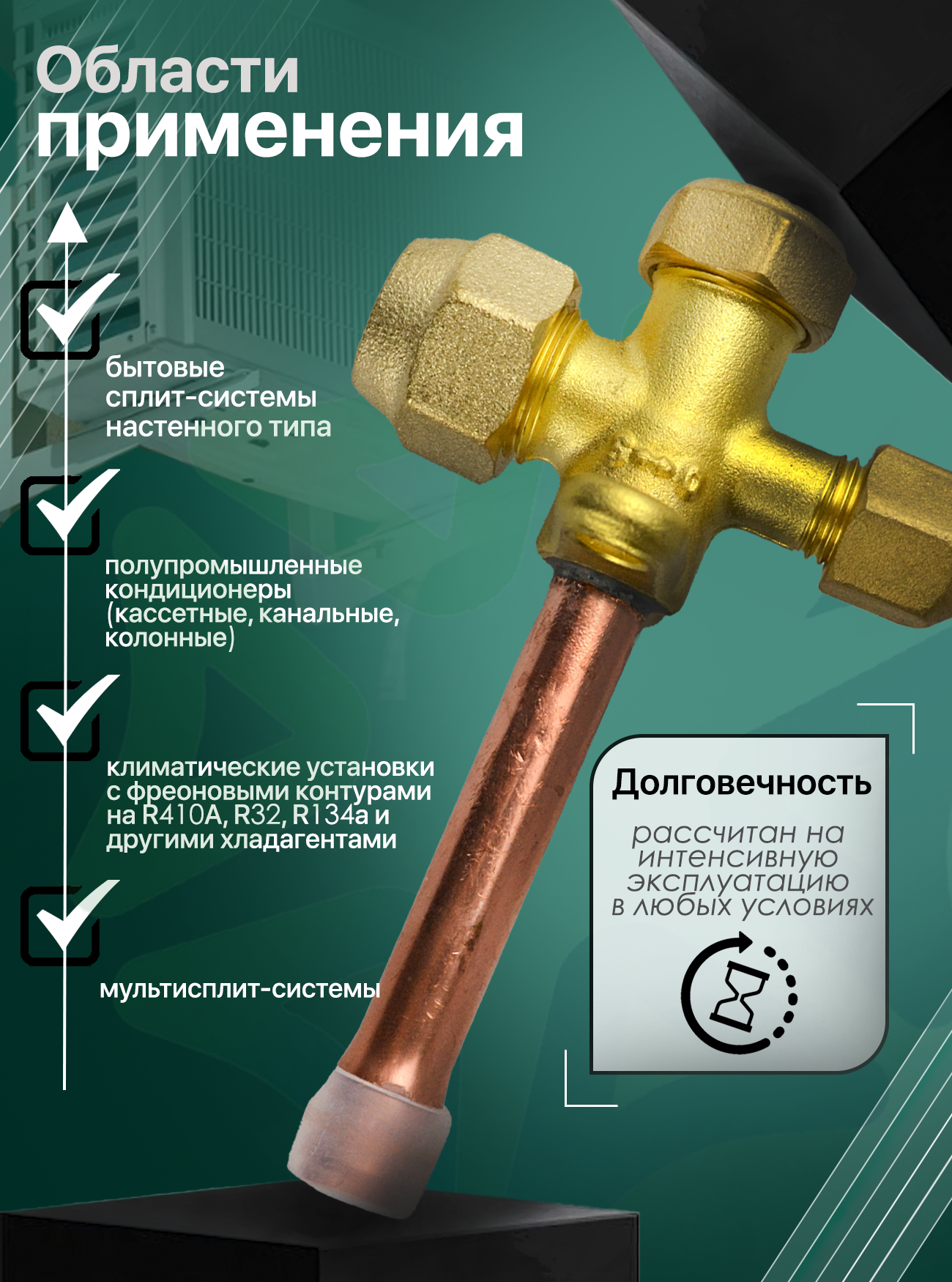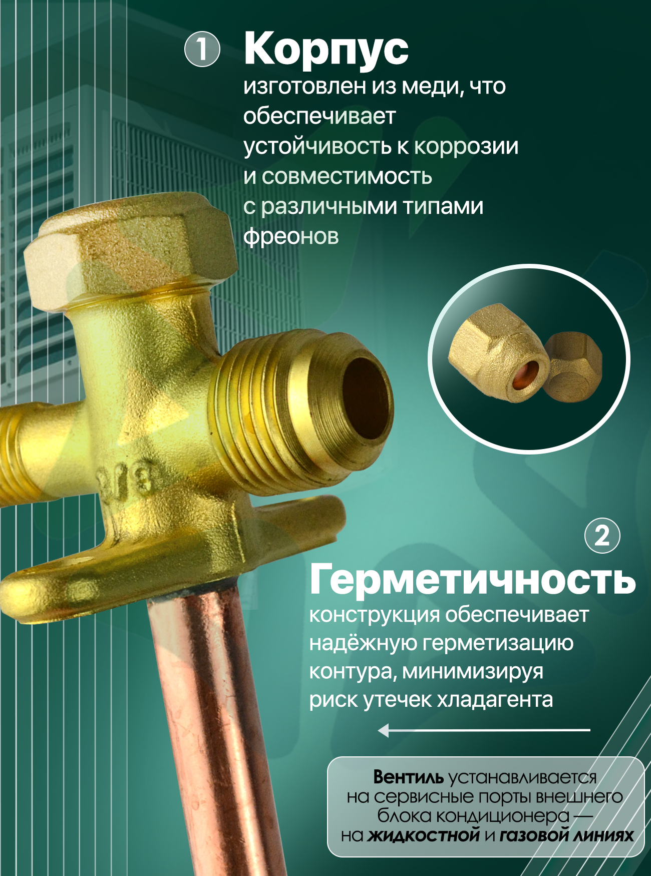 Конструкция вентиля выполнена в угловом исполнении, что значительно упрощает монтаж и обслуживание в условиях ограниченного пространства — например, при плотной компоновке элементов на внешнем блоке кондиционера. Основной корпус изготовлен из меди, что гарантирует высокую устойчивость к коррозии, совместимость с большинством современных хладагентов (включая R410A, R32, R134a и другие) и долговечность эксплуатации в условиях перепадов температур и давления.