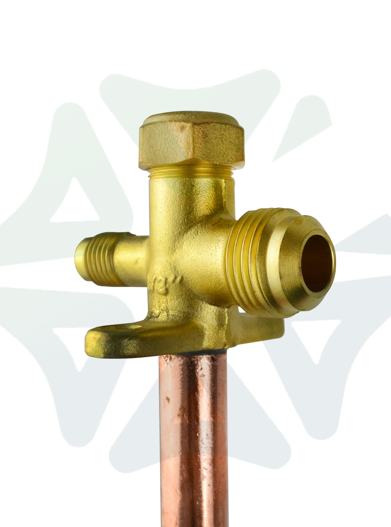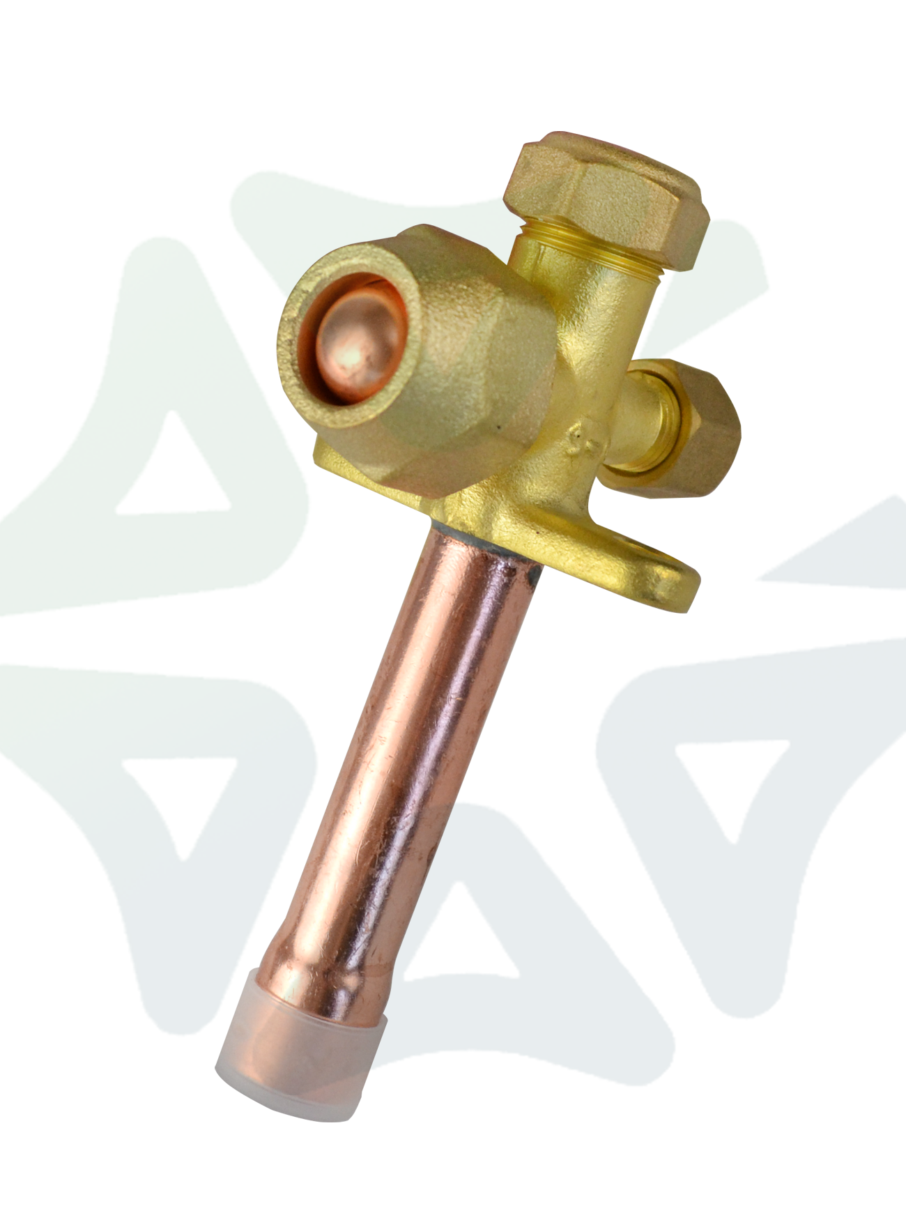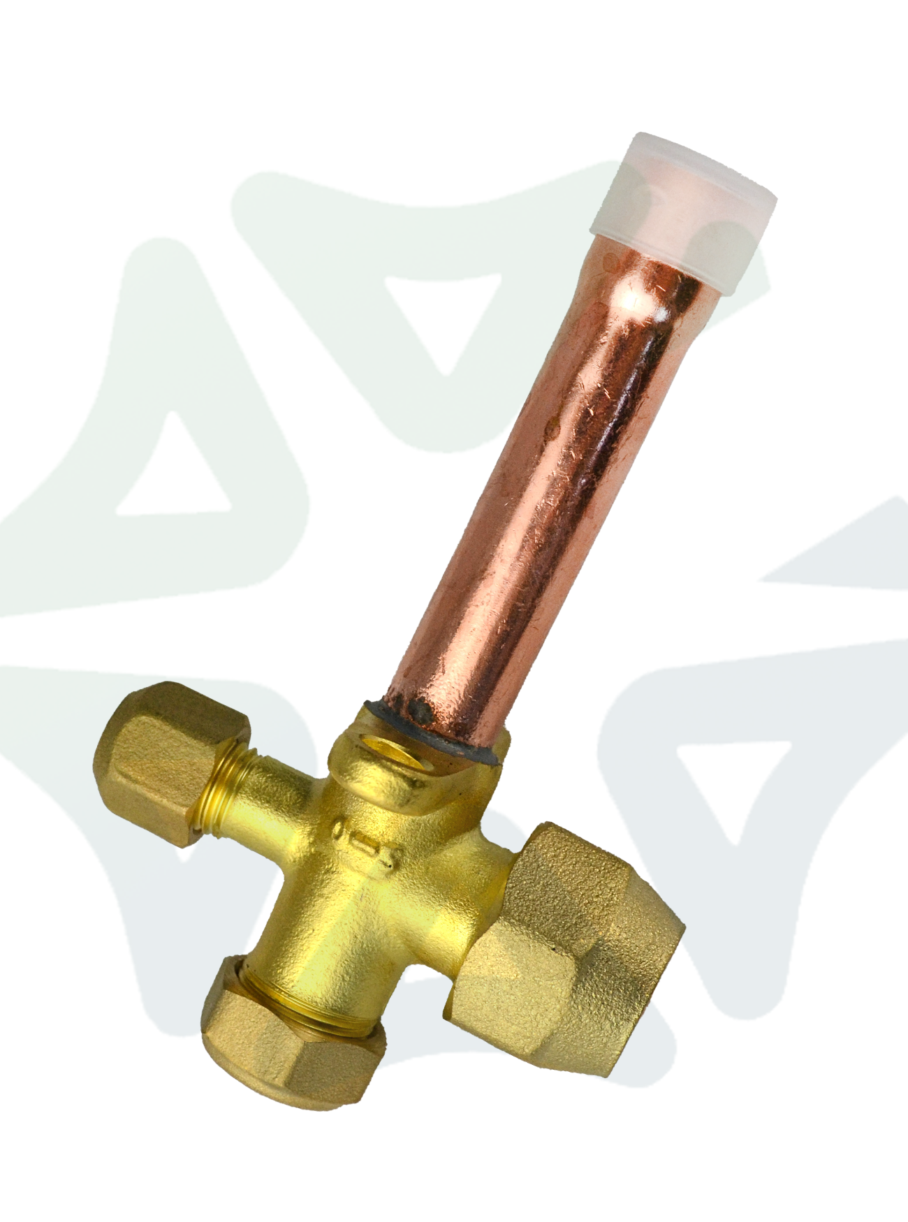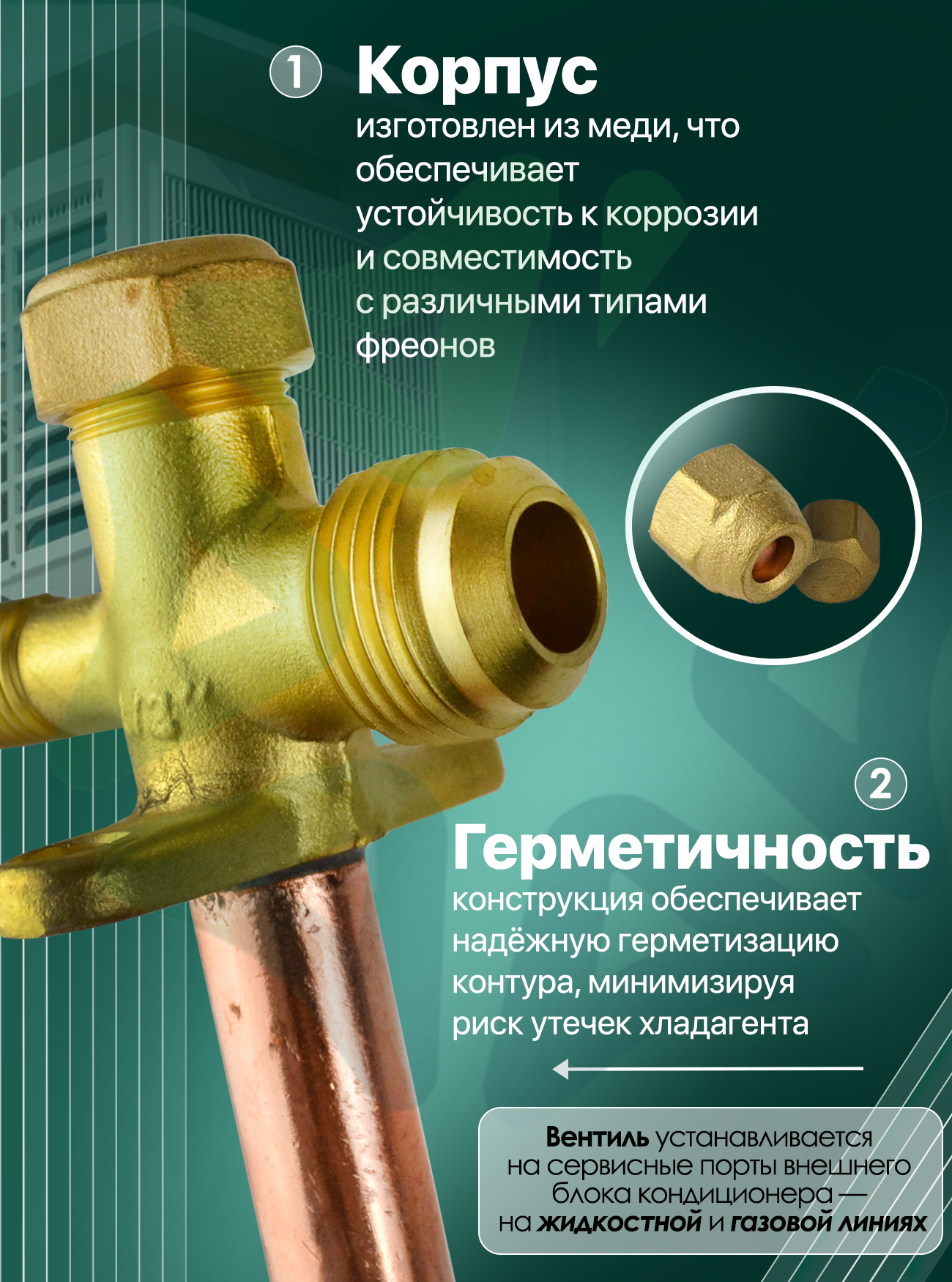 Конструкция вентиля выполнена в угловом исполнении, что значительно упрощает монтаж и обслуживание в условиях ограниченного пространства — например, при плотной компоновке элементов на внешнем блоке кондиционера. Основной корпус изготовлен из меди, что гарантирует высокую устойчивость к коррозии, совместимость с большинством современных хладагентов (включая R410A, R32, R134a и другие) и долговечность эксплуатации в условиях перепадов температур и давления.