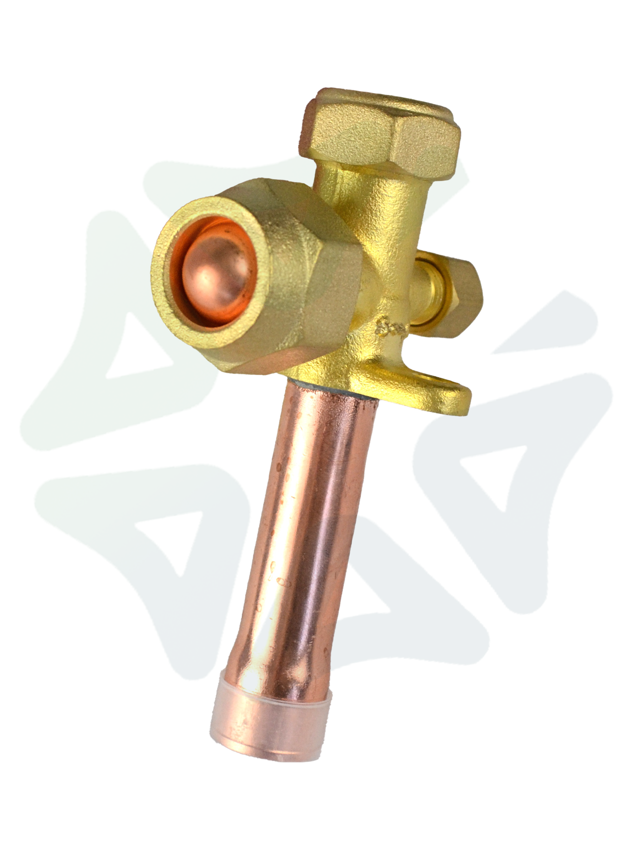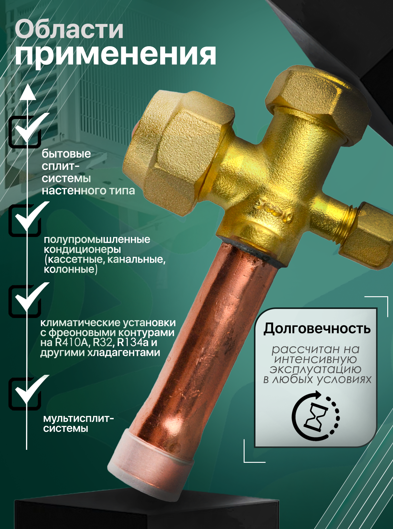 Конструкция вентиля выполнена в угловом исполнении, что значительно упрощает монтаж и обслуживание в условиях ограниченного пространства — например, при плотной компоновке элементов на внешнем блоке кондиционера. Основной корпус изготовлен из меди, что гарантирует высокую устойчивость к коррозии, совместимость с большинством современных хладагентов (включая R410A, R32, R134a и другие) и долговечность эксплуатации в условиях перепадов температур и давления.