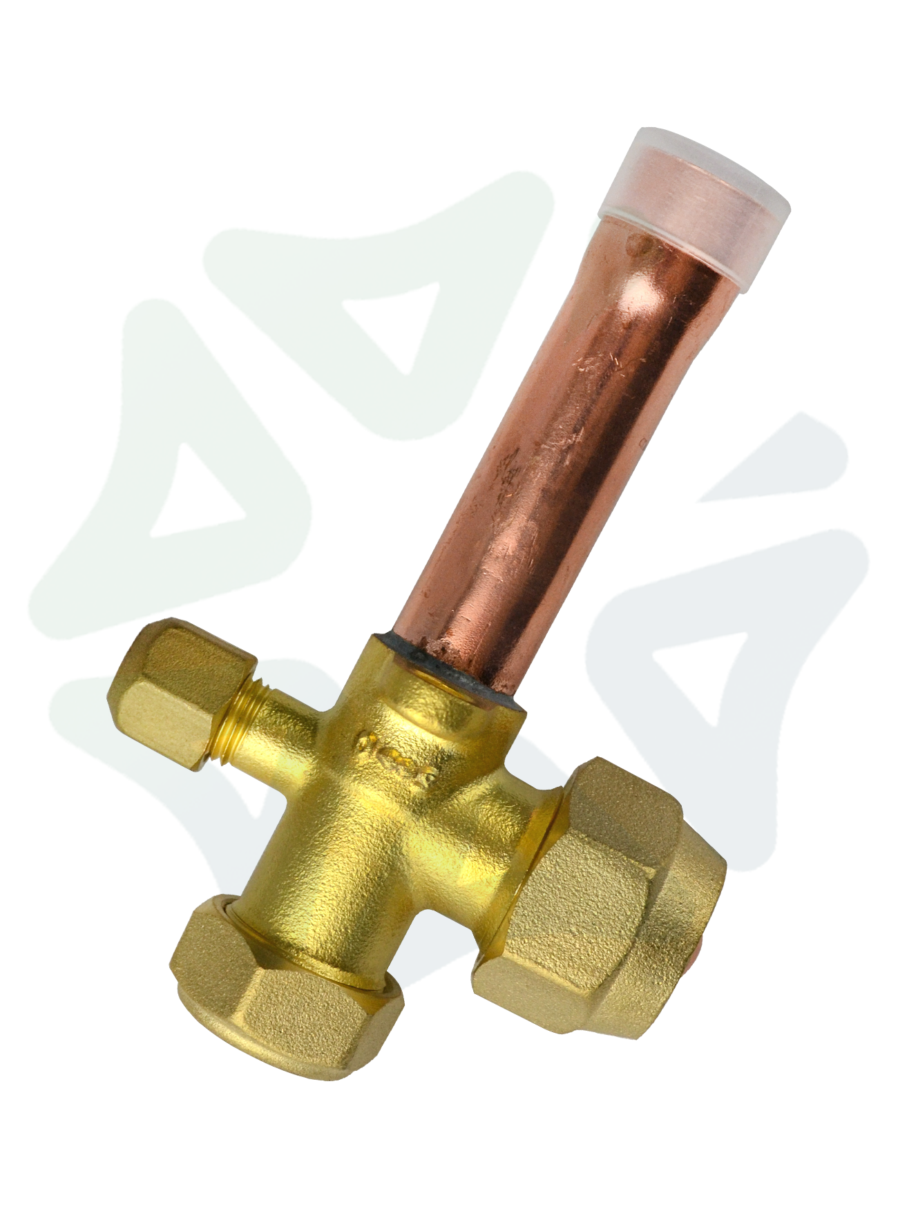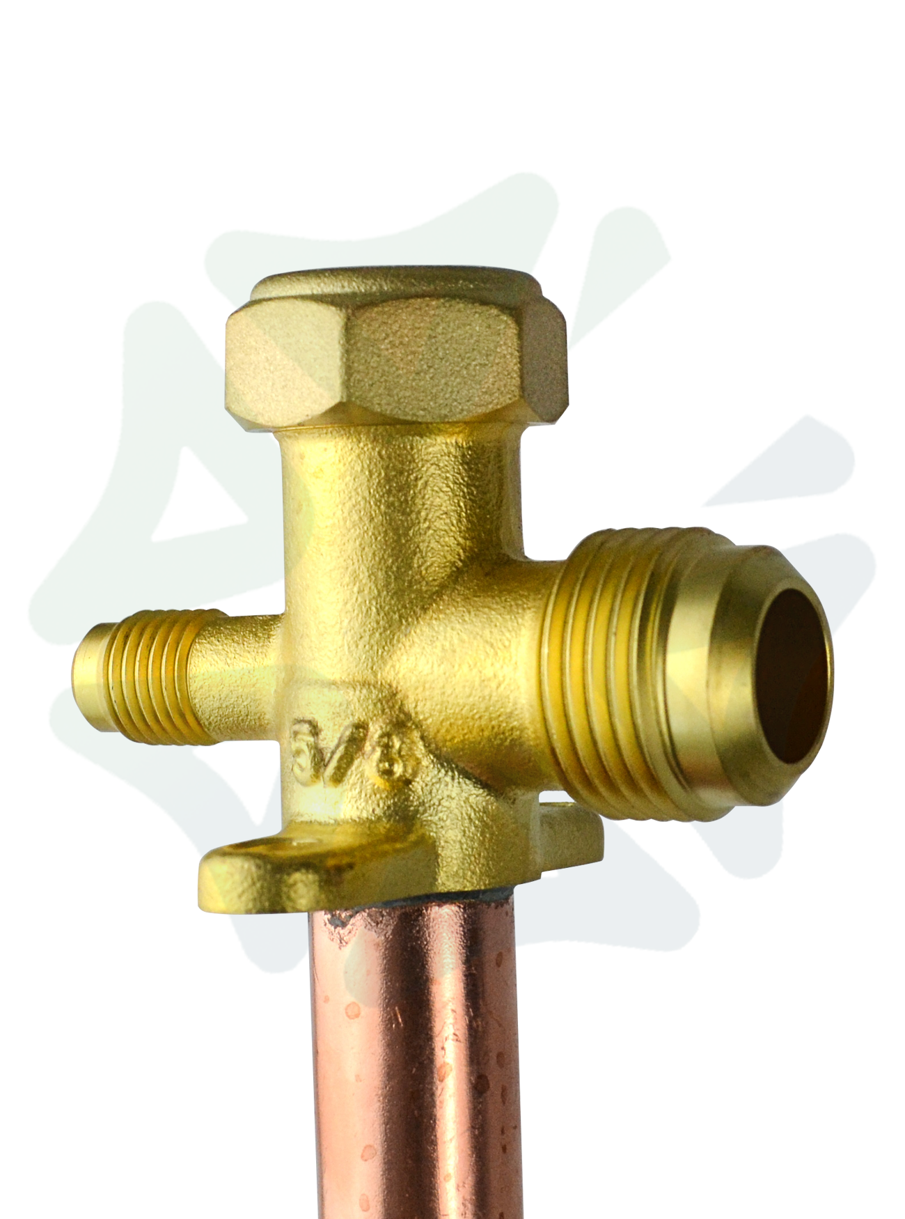 Вентиль имеет три основных патрубка с присоединительным размером 5/8" (15,9 мм, стандарт 5/8" SAE) для подключения к жидкостной и газовой линиям фреонопровода. Ключевой элемент конструкции — сервисный порт с клапаном Шредера, который служит точкой подключения внешнего оборудования: манометрической станции, заправочных шлангов, вакуумного насоса или течеискателя. Максимальное рабочее давление — 28 бар, что соответствует нагрузкам в современных системах кондиционирования.