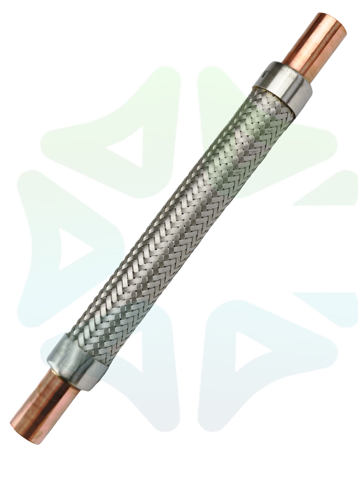 Конструкция виброгасителя проста, но эффективна. Основным элементом является гофрированная трубка из нержавеющей стали, защищенная от внешних воздействий оплеткой из стальной нержавеющей проволоки. Эта оплетка принимает на себя удары, трение и другие механические нагрузки, обеспечивая сохранность гофрированной трубки. Соединение стальной трубки и медного оконечника выполнено с использованием серебросодержащего припоя, что гарантирует прочное и надежное соединение.