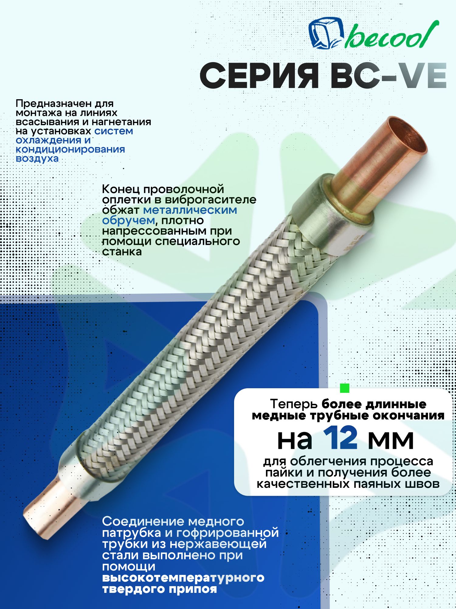 Виброгаситель BC-VE-6 с присоединительным размером 3/4" и типом соединения под пайку или сварку выдерживает рабочее давление до 34 бар. Удлиненные медные патрубки предотвращают перегрев при монтаже, а концы проволочной оплетки обжаты металлическим обручем для дополнительной прочности. Каждый виброгаситель Becool имеет фирменный логотип и маркировку с указанием наименования, марки и размеров присоединительного патрубка.