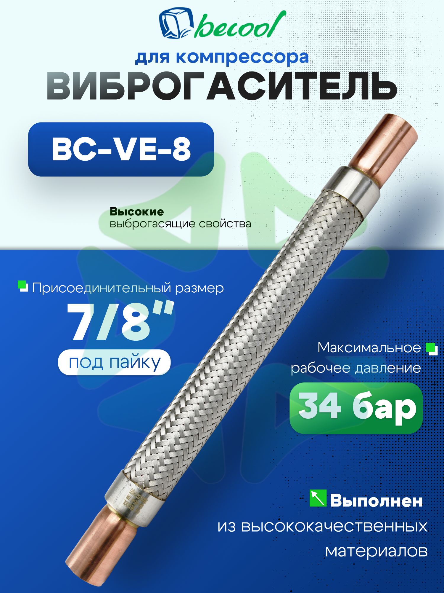 Виброгаситель BC-VE-8 с присоединительным размером 7/8" и типом соединения под пайку или сварку выдерживает рабочее давление до 34 бар. Удлиненные медные патрубки предотвращают перегрев при монтаже, а концы проволочной оплетки обжаты металлическим обручем для дополнительной прочности. Каждый виброгаситель Becool имеет фирменный логотип и маркировку с указанием наименования, марки и размеров присоединительного патрубка.