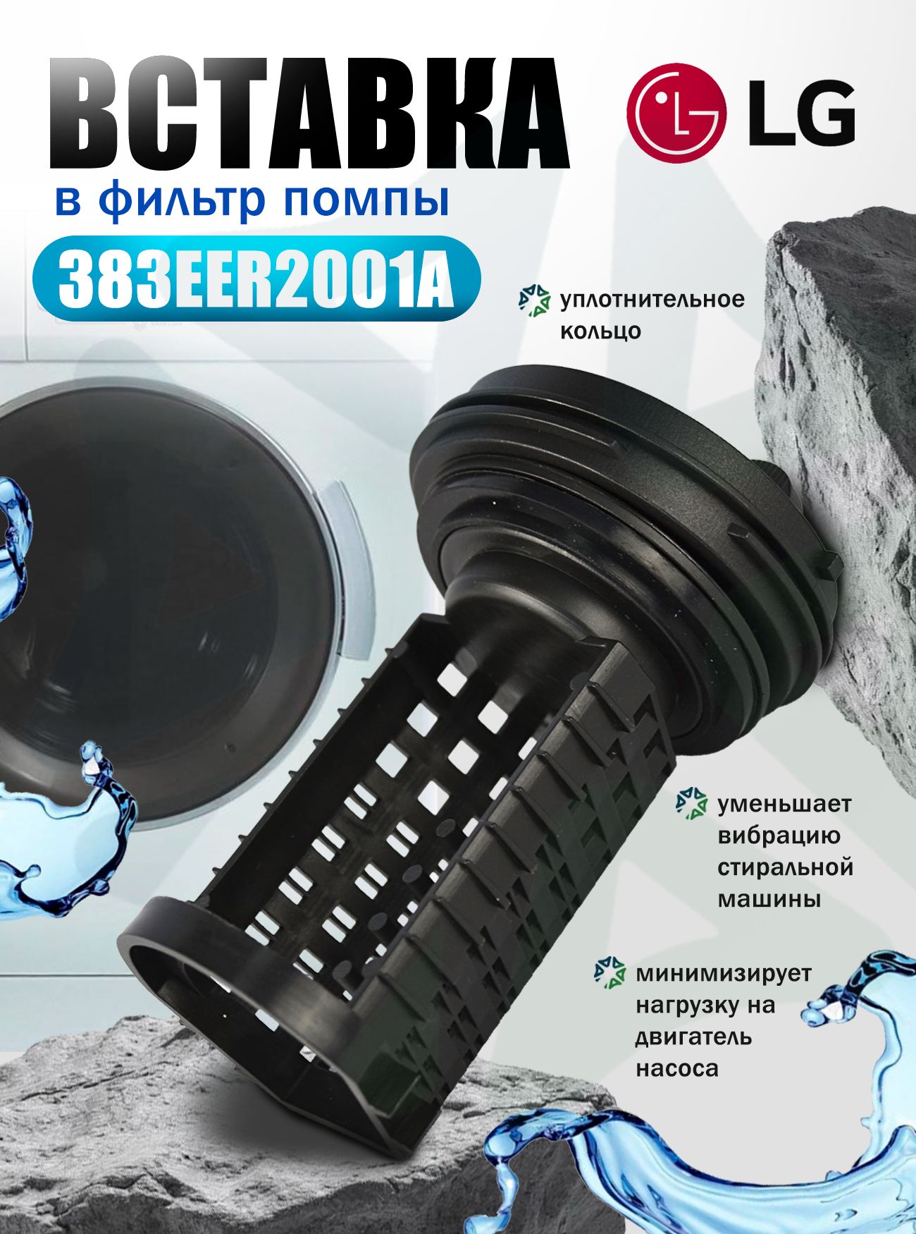 Вставка 383EER2001A в фильтр помпы для стиральных машин LG - это ключевая деталь сливной системы, обеспечивающая защиту насоса от механических повреждений и предотвращающая засоры. Данная вставка - это комбинированная заглушка‑фильтр (пробка сливного насоса), которая устанавливается в посадочное место помпы и выполняет сразу несколько функций: пропускает воду, задерживает посторонние предметы и герметизирует соединение.